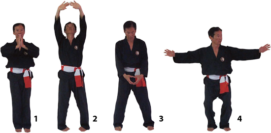 Ramiona wykonują dwa obroty w tył z otwartymi dłońmi, potem powoli podnoszą się z dłońmi na wysokość oczu z zaciśniętymi pięściami.