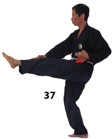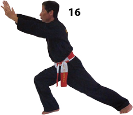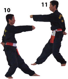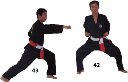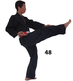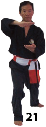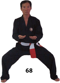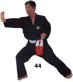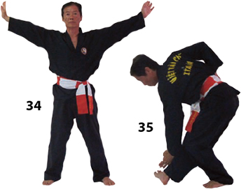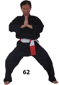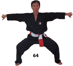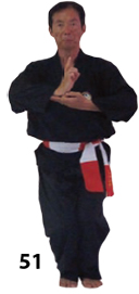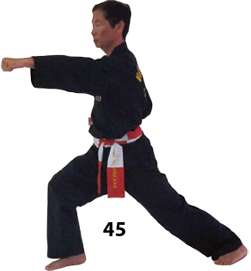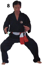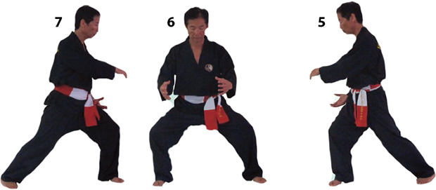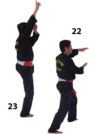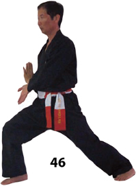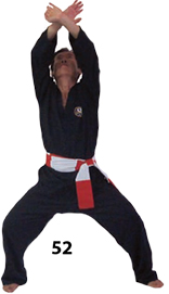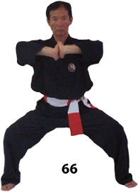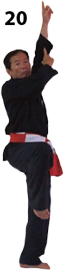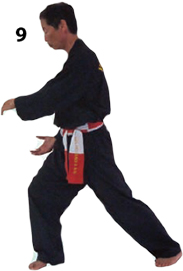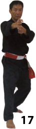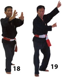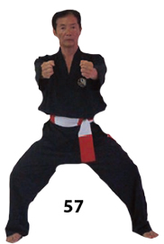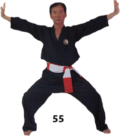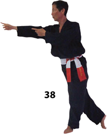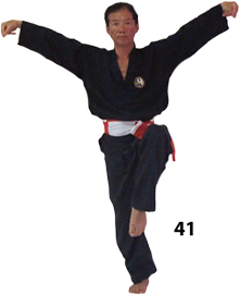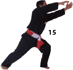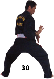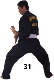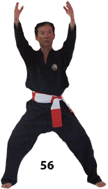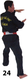 Przesuwamy ciężar naszego ciała do THAI DUONG TAN, prawa noga z przodu. Nasz wzrok jest na północ, podczas gdy nasze ręce atakują krawędzią na południe. Nasze stopy również skierowane są na południe. Znów przesuwamy nasz ciężar ciała na lewą nogę podnosząc się w DUONG DUY TAN. Palce połączone niczym dziób ptaka.